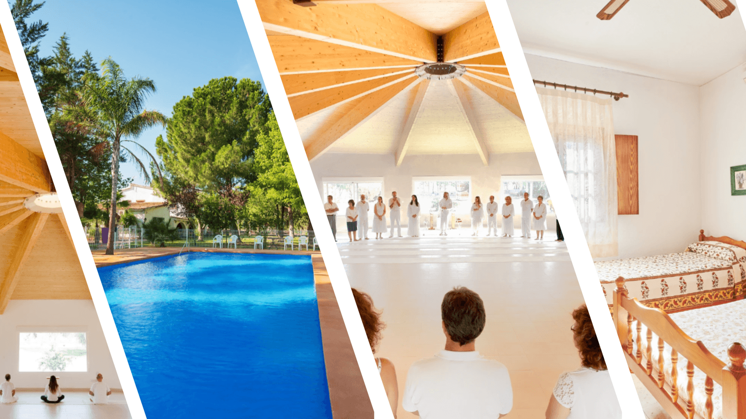 El Ashram cuenta con diferentes salas, y espacios exteriores para las actividades. Cuando el tiempo es adecuado las comidas son en el porche exterior con vistas al jardín, y podemos disfrutar de todo el recinto, incluida la piscina